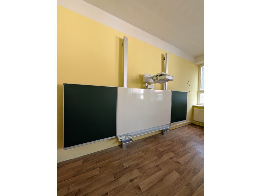 Interaktivní tabule Epson EB-770Fi v kombinaci s keramickou tabulí triptych na pylonech 200 x 120. Svítivost 4100 Lumens / Full HD. Ovládání dotykem i pery. Montáž zdarma.