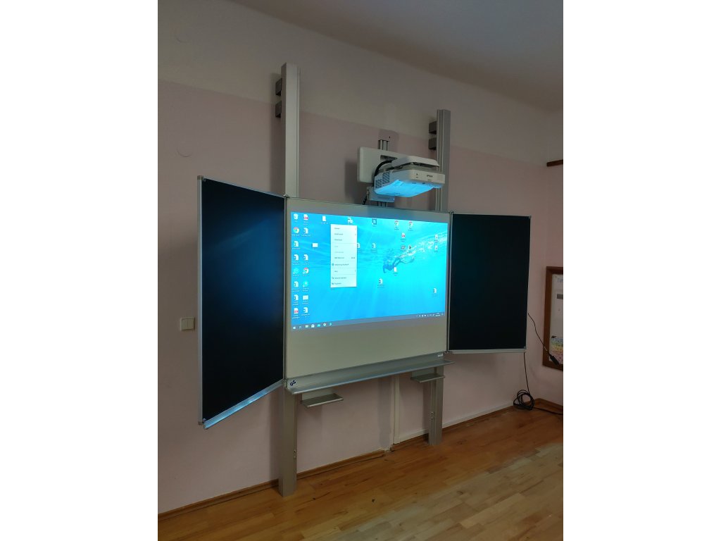 - Interaktivní tabule - keramická tabule triptych na pylonech s interaktivním projektorem.