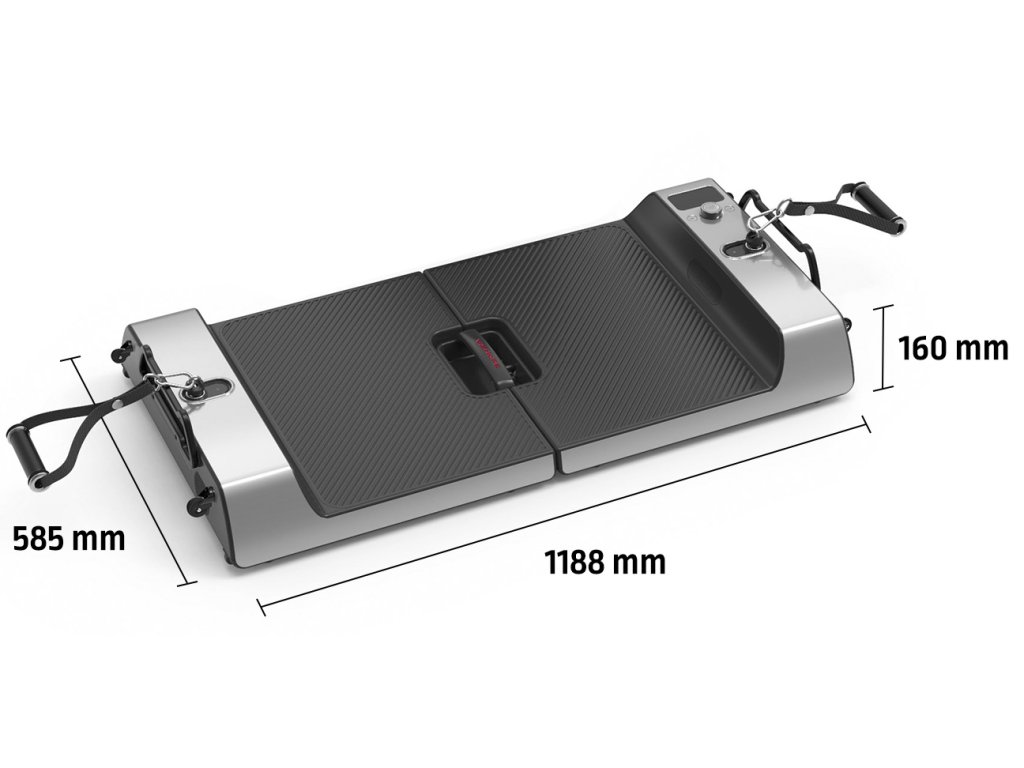 Rozměry v rozloženém stavu: 120x59x16 cm (délka x šířka x výška). Rozměry po složení : 59x 32 x 61 cm (délka x šířka x výška). Čistá hmotnost : 36 kg. Rozsah zatížení : Maximální zatížení je 130 kg v rozmezí 1,5 kg - 65 kg na každou stranu. Změna zatížení : každých 0,5 kg na každou stranu. Zvuk : Vysoce kvalitní stereo reproduktory. Napájení : 220 - 240 V. Standardní příslušenství : madla, kotníkové popruhy, bederní pás, bezdrátové tlačítko, činka.