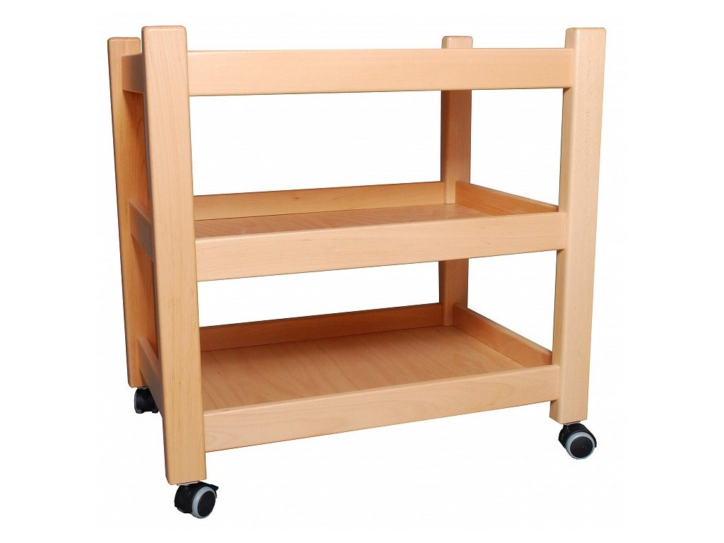Díky kolečkům je snadno přemístitelný, což umožňuje flexibilní použití v různých částech školky. Stabilní konstrukce a bezpečnostní prvky zajišťují, že vozíček zůstane pevně na místě během používání. Vozíček je opatřen čtyřmi kolečky - dvě jsou s brzdou a dvě bez. Je vyroben z pevného bukového dřeva. Ochráněn nezávadným přírodním lakem. Tento servírovací vozíček je neocenitelným pomocníkem pro hladký provoz během jídla a dalších aktivit ve školce. Poskytuje dostatek prostoru pro talíře, příbory, nápoje a další potřeby, což pomáhá udržovat pořádek.