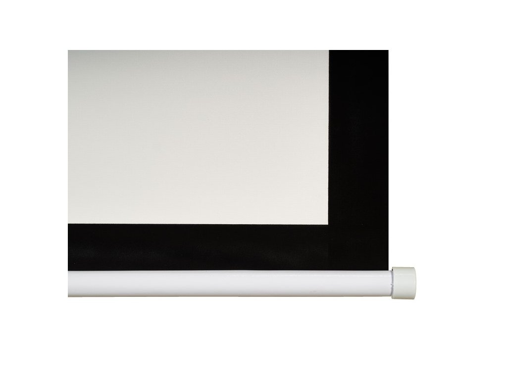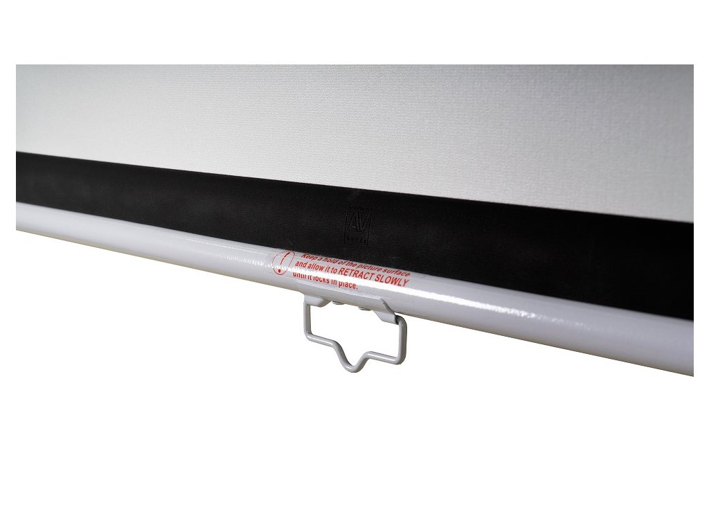 Roletové promítací plátno Avtek Cinema. Montáž na stěnu nebo strop, manuální rolování, bílé kovové pouzdro, černé boční rámečky, výškově nastavitelná spodní lišta.