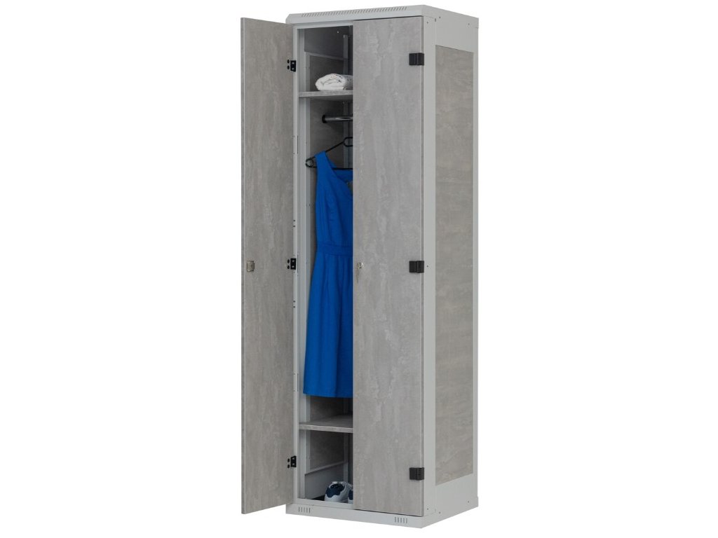 Skříň disponuje nadčasovým designem v několika dekorech, které se hodí do každého interiéru. Skříňky je možné sešroubovat k sobě a vytvořit tak jeden kompaktní celek. Perforace na plechové konstrukci zaručuje účinné odvětrávání. Veškeré hrany jsou opatřeny 2 mm ABS hranou. Svařovaný korpus z ocelového plechu tloušťky 0,8 až 1 mm zaručuje vysokou tuhost a minimalizuje náročnost na montáž. Skříňky mají předvrtané otvory pro případné doplnění polic. Součástí každé skříně jsou 2 police, 2 šatní chromované tyče, zámek a nivelační nožičky. (U rozměru 197 x 60 x 50 cm jsou 4 police). Unikátní systém pantů umožňuje dvířka otevřít pod úhlem až 180°.