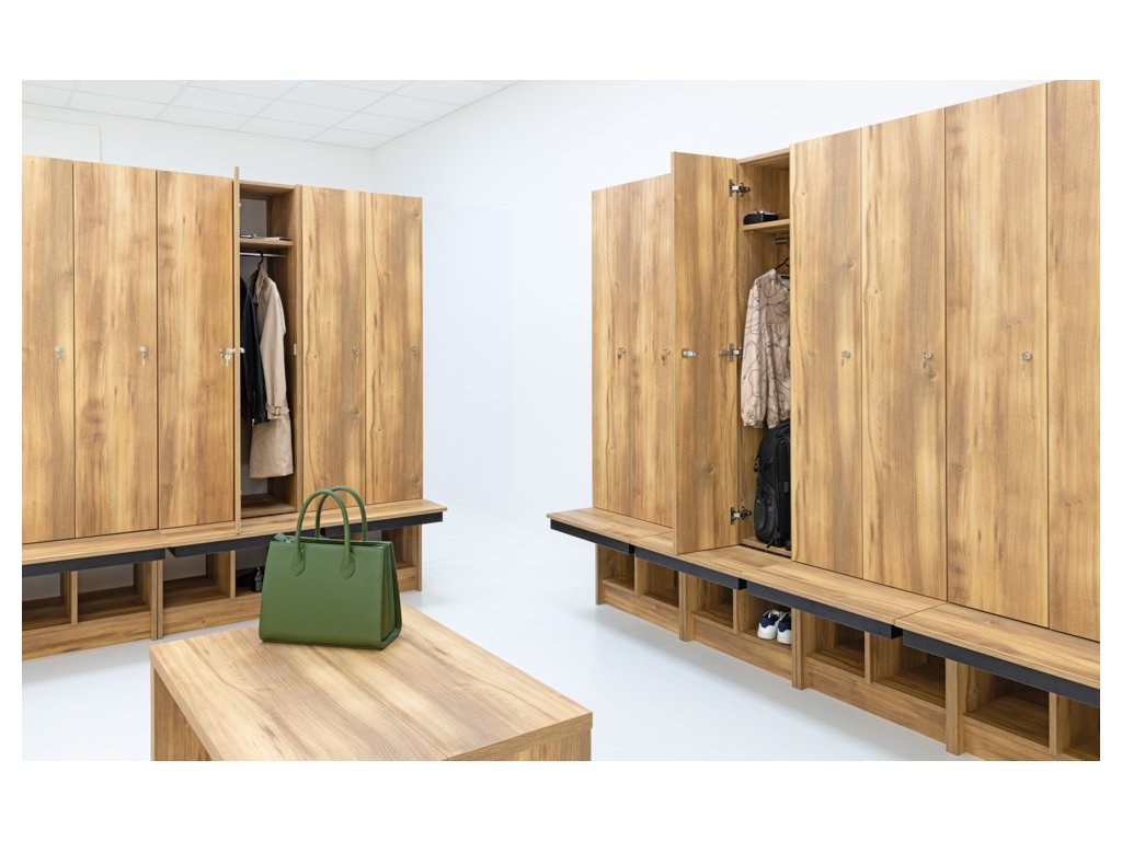 Šatní skříň 2 -dvéřové lamino s lavičkou je vyráběná kompletně z kvalitní laminované dřevotřísky o síle 18 mm. Rozměry šatní skříně jsou: výška: 1970 mm, šířka 600 mm a hloubka 780 mm. Vybrat si můžete hned z několika barevných dekorů. Svým provedením a vysokou kvalitou se tato skříňka stane vkusnou součástí Vašeho interiéru, ať už ve škole, školce, kanceláři, nemocnici nebo třeba ve fitness centru.