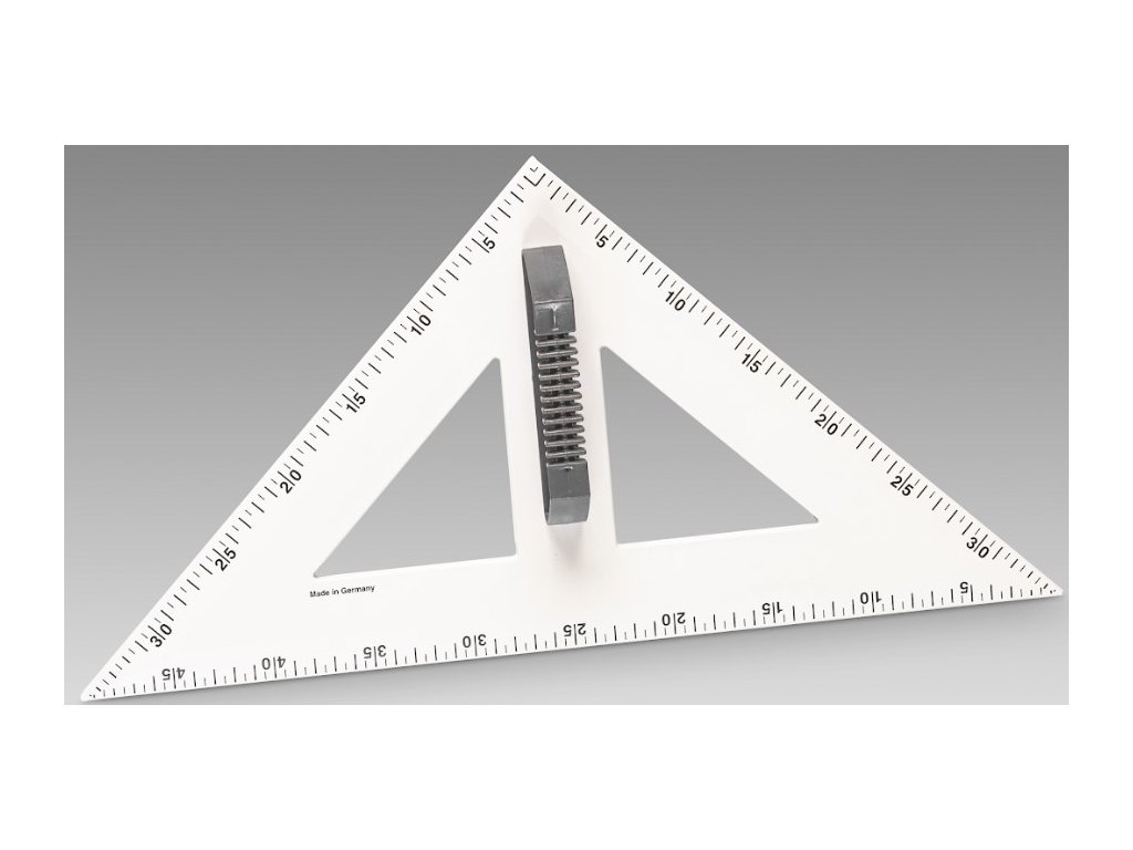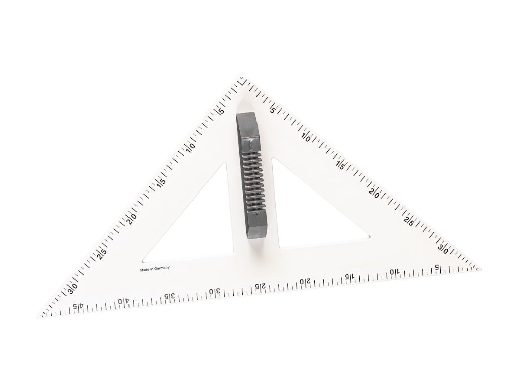 Nevhodně zvolené rýsovací pomůcky jsou jednou z nejčastějších příčin poškrábání popisné plochy tabule. Používejte proto vždy jen specializované produkty, jako například rovnoramenný trojúhelník, doporučovaný samotným výrobcem tabulí. Je vyroben v Německu právě s důrazem na příjemné používání a bezpečnost. Jeho zadní stranu zdobí gumové výstupky, bránící nejen poškození popisné plochy tabule, ale také posuvu trojúhelníku během rýsování či rozmazání fixu. K vyšší přesnosti a pohodlnosti pak přispívá praktický držák. Rovnoramenný trojúhelník je vhodný pro popisovač i křídu a jeho rozměry činí 35 x 35 x 50 cm.